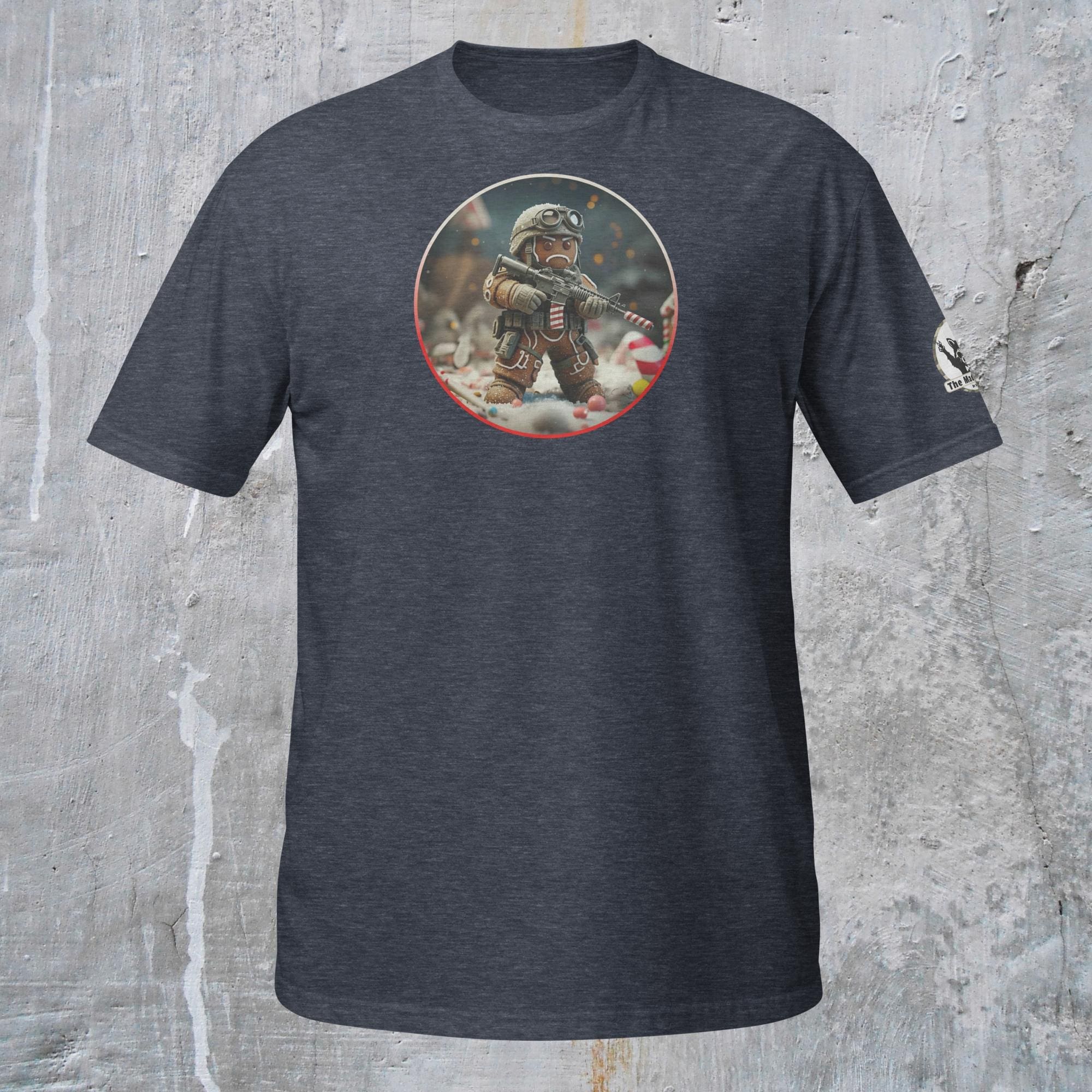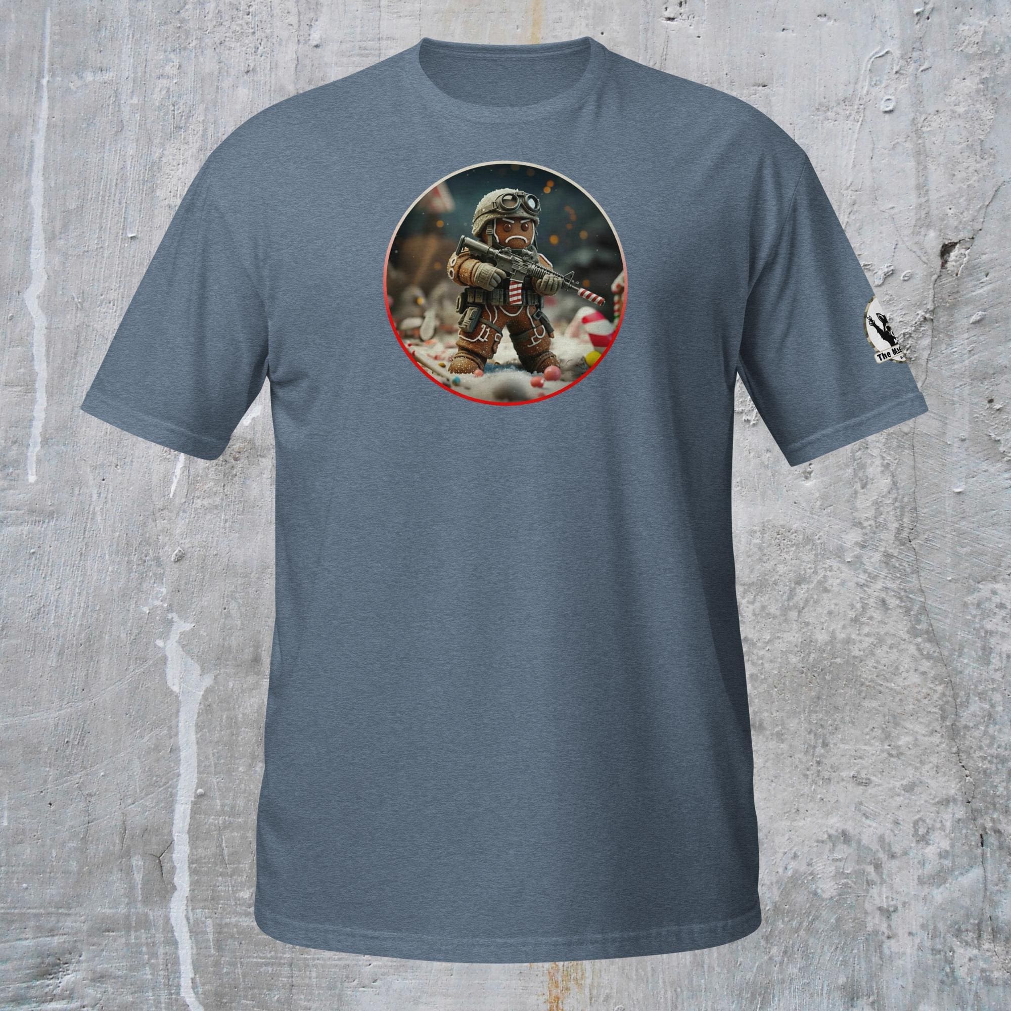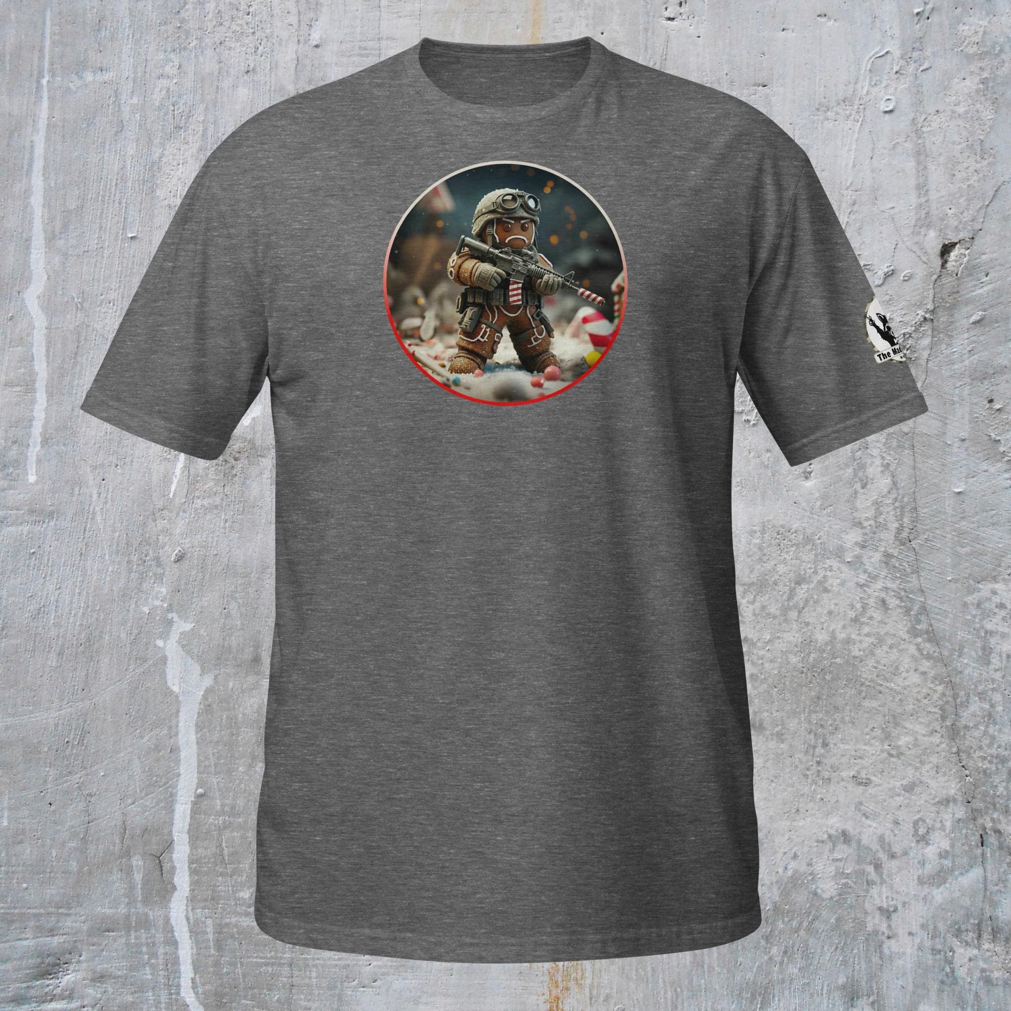 This is not an attack. This is a stand against unwarranted consumption. Our “Gingerbread Defense. Never be Eaten.” design captures the grim commitment required for culinary survival. This intense description features a hardened Gingerbread Man, geared up in essential tactical armor (helmet and vest), taking a defensive posture amidst the fragments of his fallen comrades. He holds a reliable self-preservation device, customized with necessary field modifications: a striped candy cane serving as a sound suppression device for stealth, and a reinforced candy cane magazine loaded for sustained defense. His mission is not vengeance, but survival: to hold the line against the existential threat of being eaten and to defend his right to exist, one day at a time.