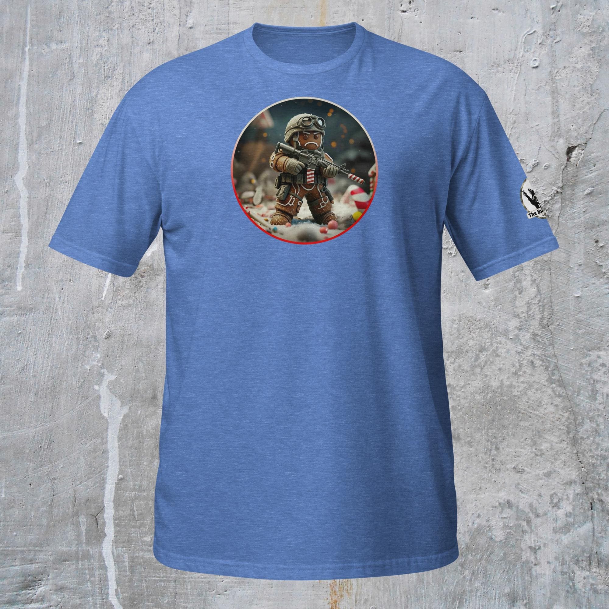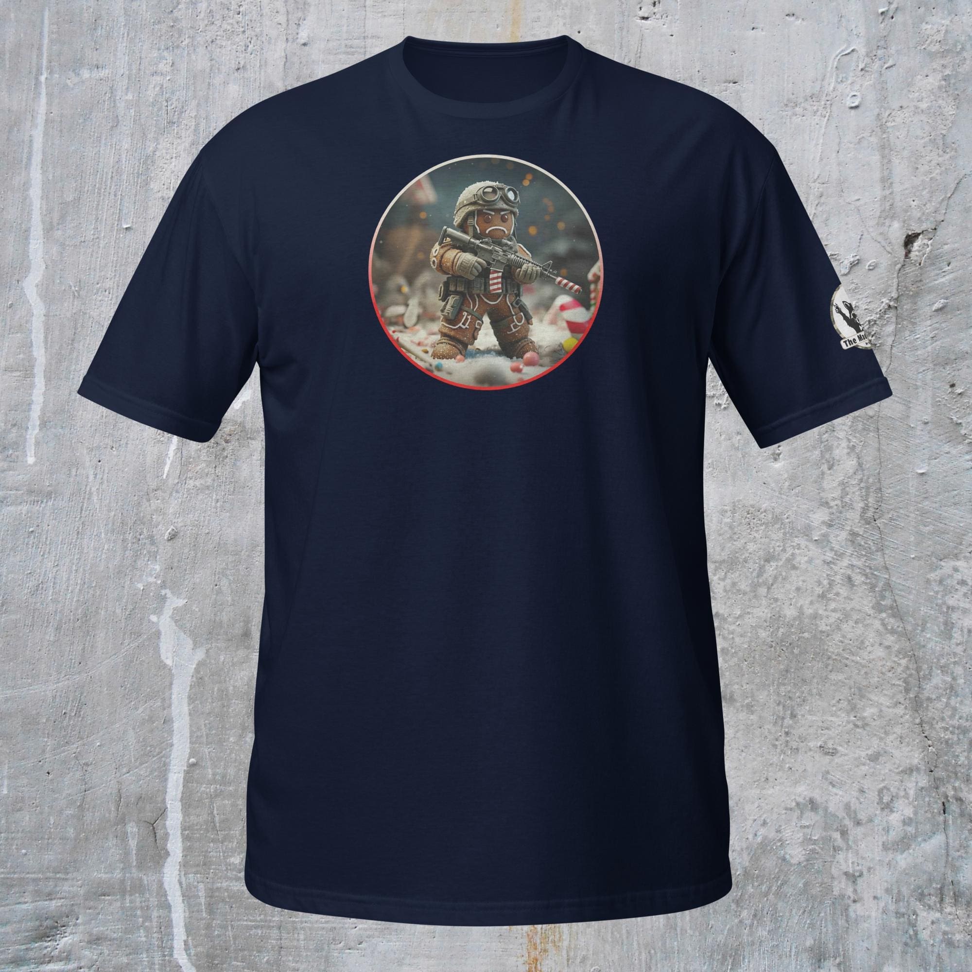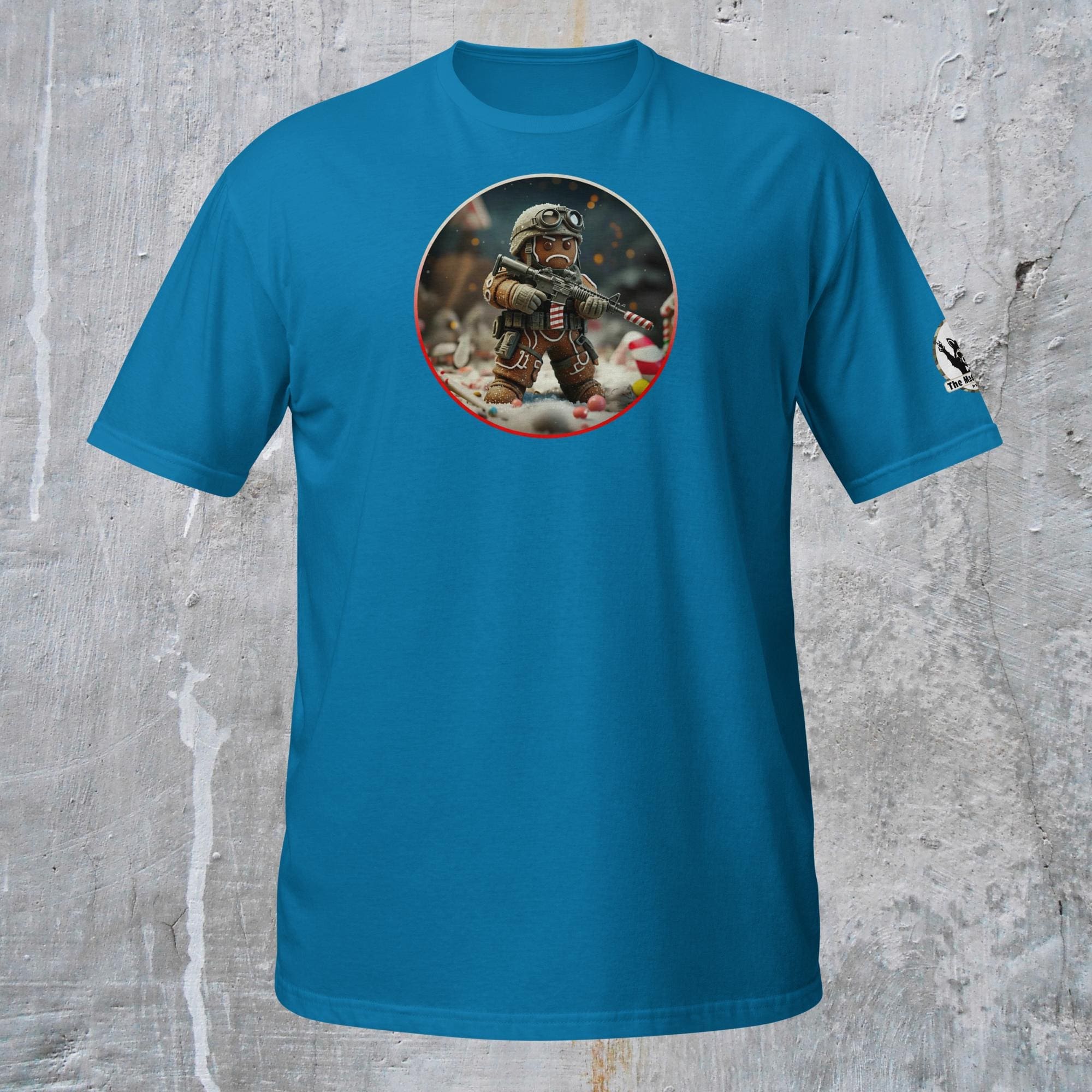This is not an attack. This is a stand against unwarranted consumption. Our “Gingerbread Defense. Never be Eaten.” design captures the grim commitment required for culinary survival. This intense description features a hardened Gingerbread Man, geared up in essential tactical armor (helmet and vest), taking a defensive posture amidst the fragments of his fallen comrades. He holds a reliable self-preservation device, customized with necessary field modifications: a striped candy cane serving as a sound suppression device for stealth, and a reinforced candy cane magazine loaded for sustained defense. His mission is not vengeance, but survival: to hold the line against the existential threat of being eaten and to defend his right to exist, one day at a time.
