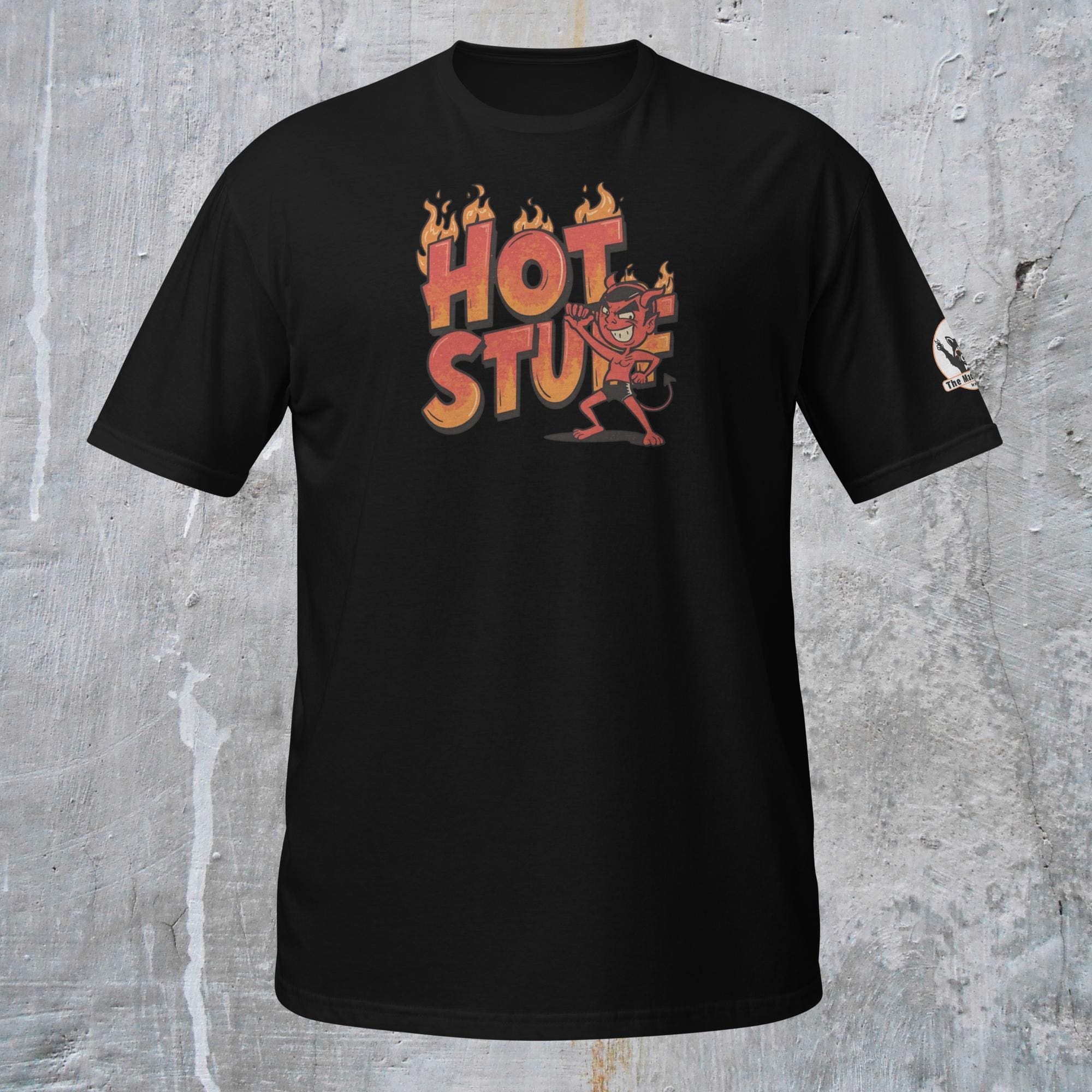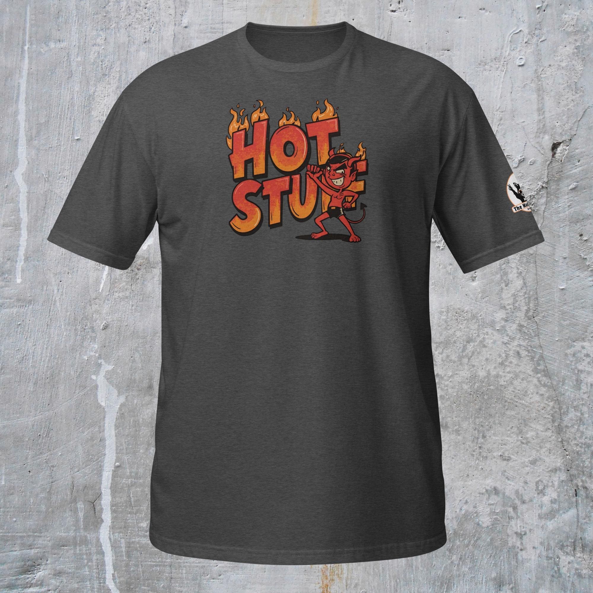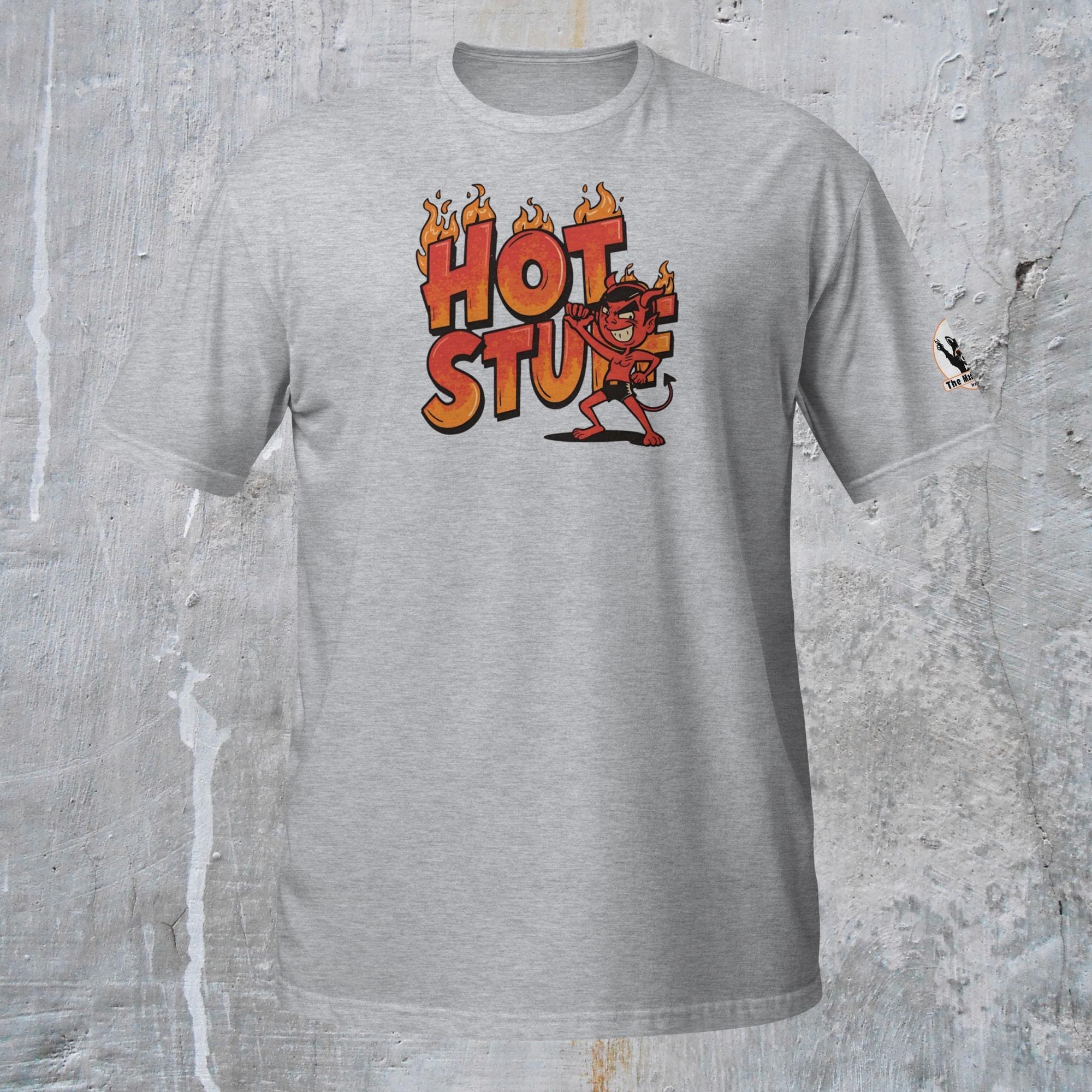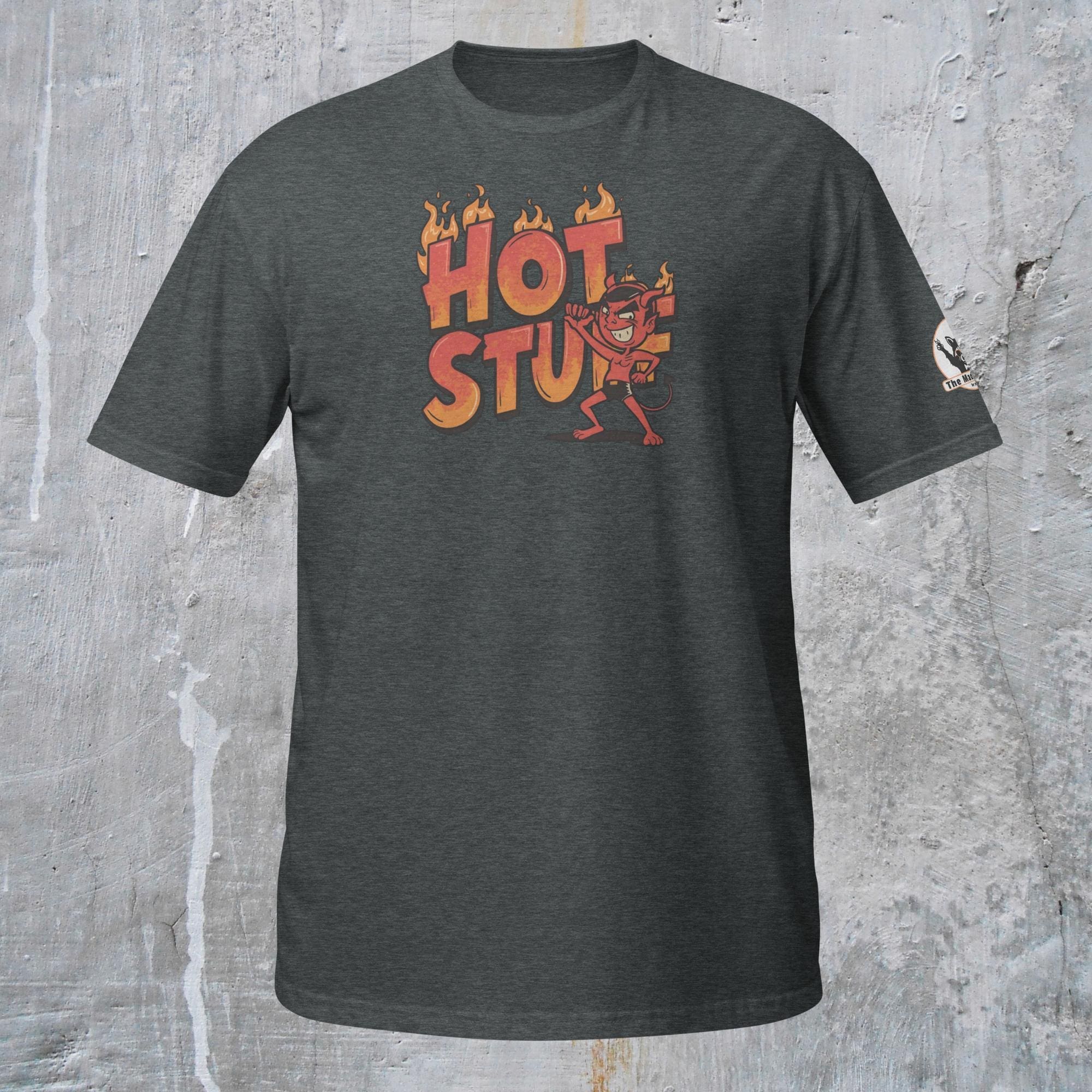 Our “Hot Stuff: The Original Fire Hazard” design is the antidote to subtle style. This description features a ridiculously confident, retro-era Devil, looking like he just stepped off the cover of a 1950s comic book and immediately caused a small but stylish disaster. He sports a self-satisfied, mischievous smile, clearly aware of his own superior heat. Behind him, the words “Hot Stuff.” are literally bursting into flames, because simply being hot wasn’t dramatic enough. He didn’t ask for the flames, they just happen when he walks into a room.