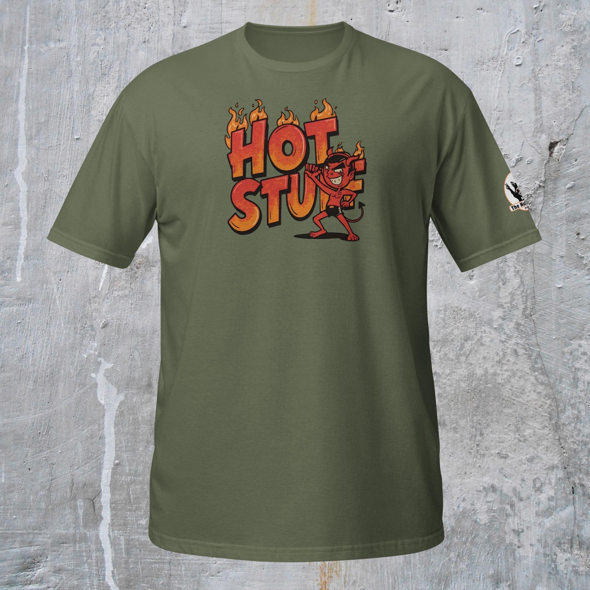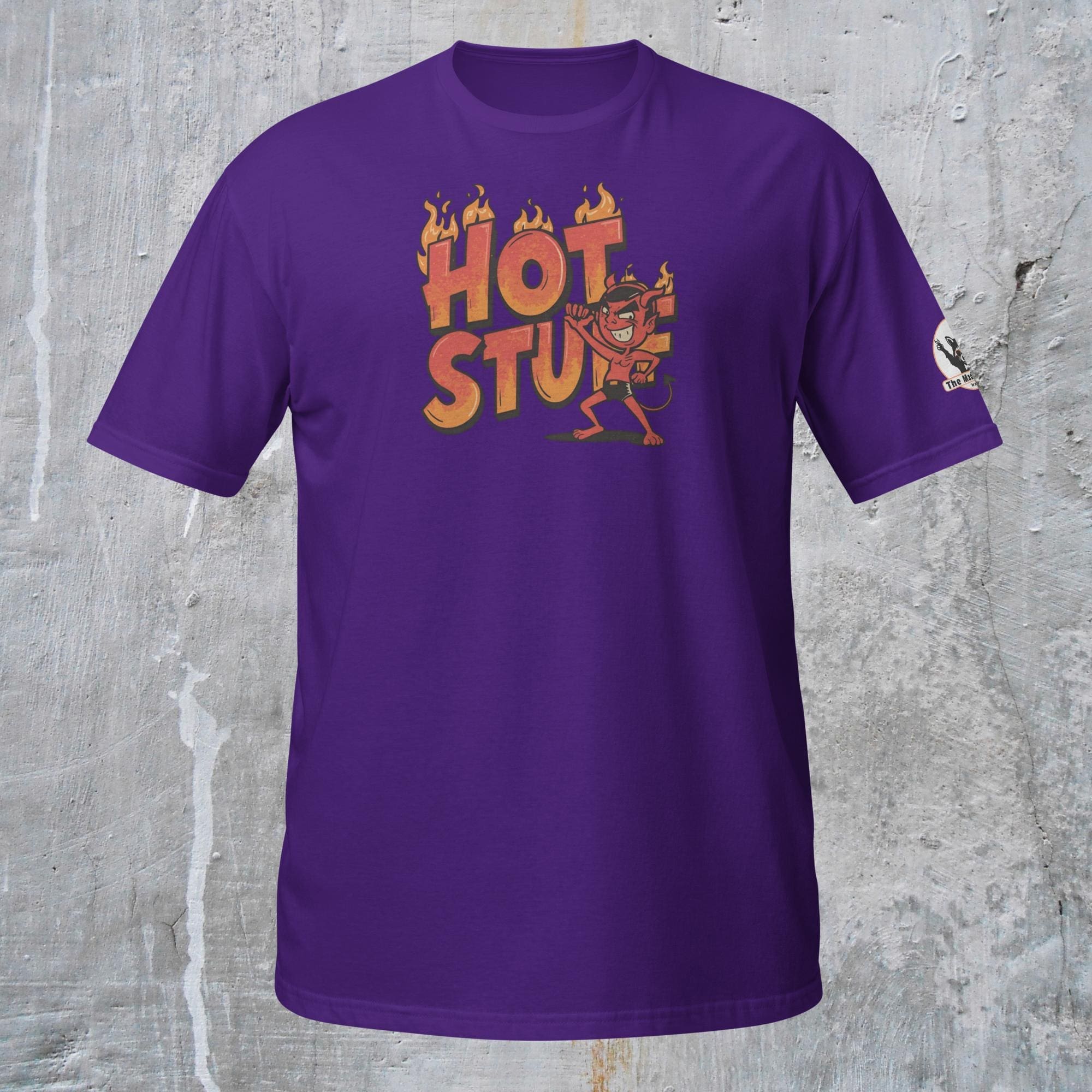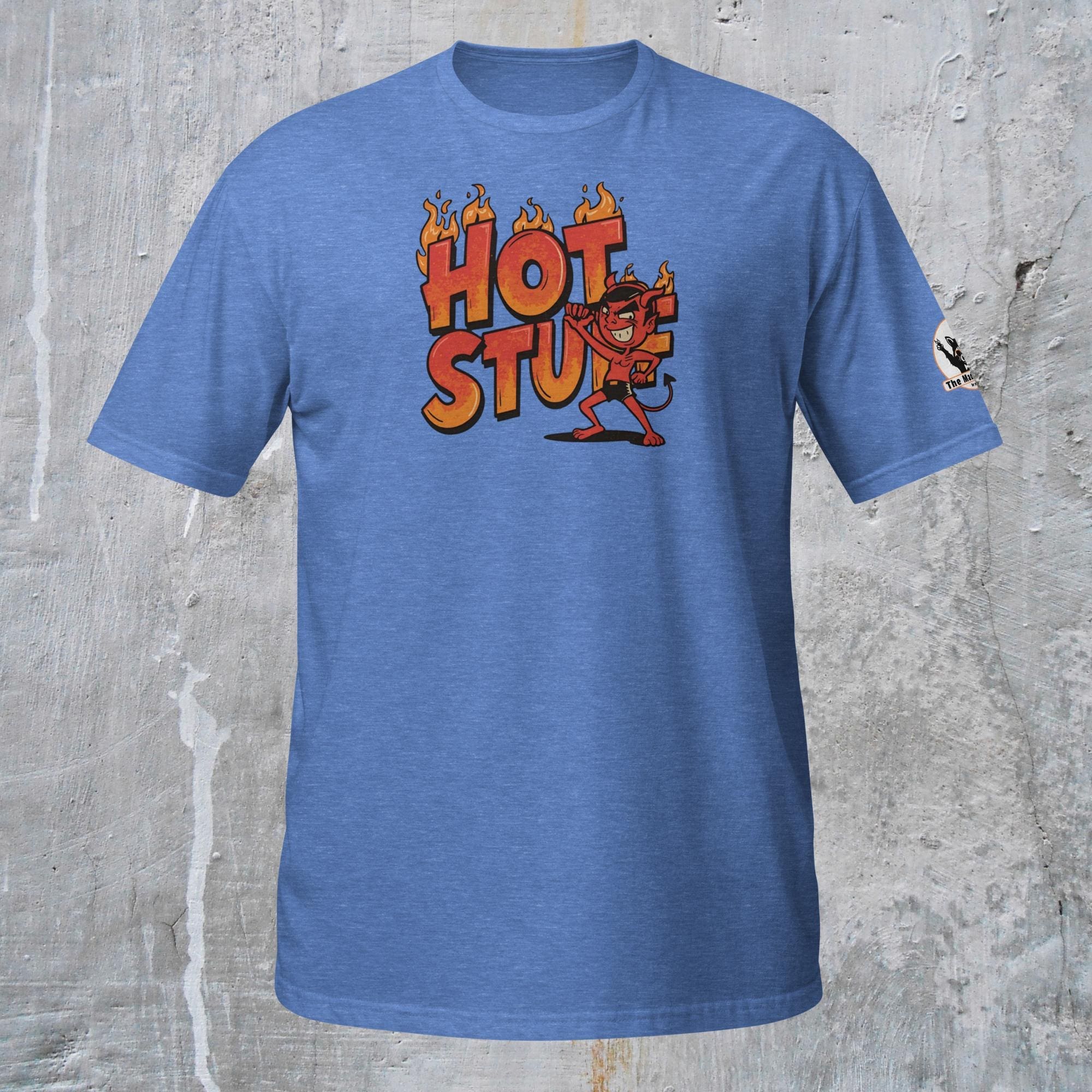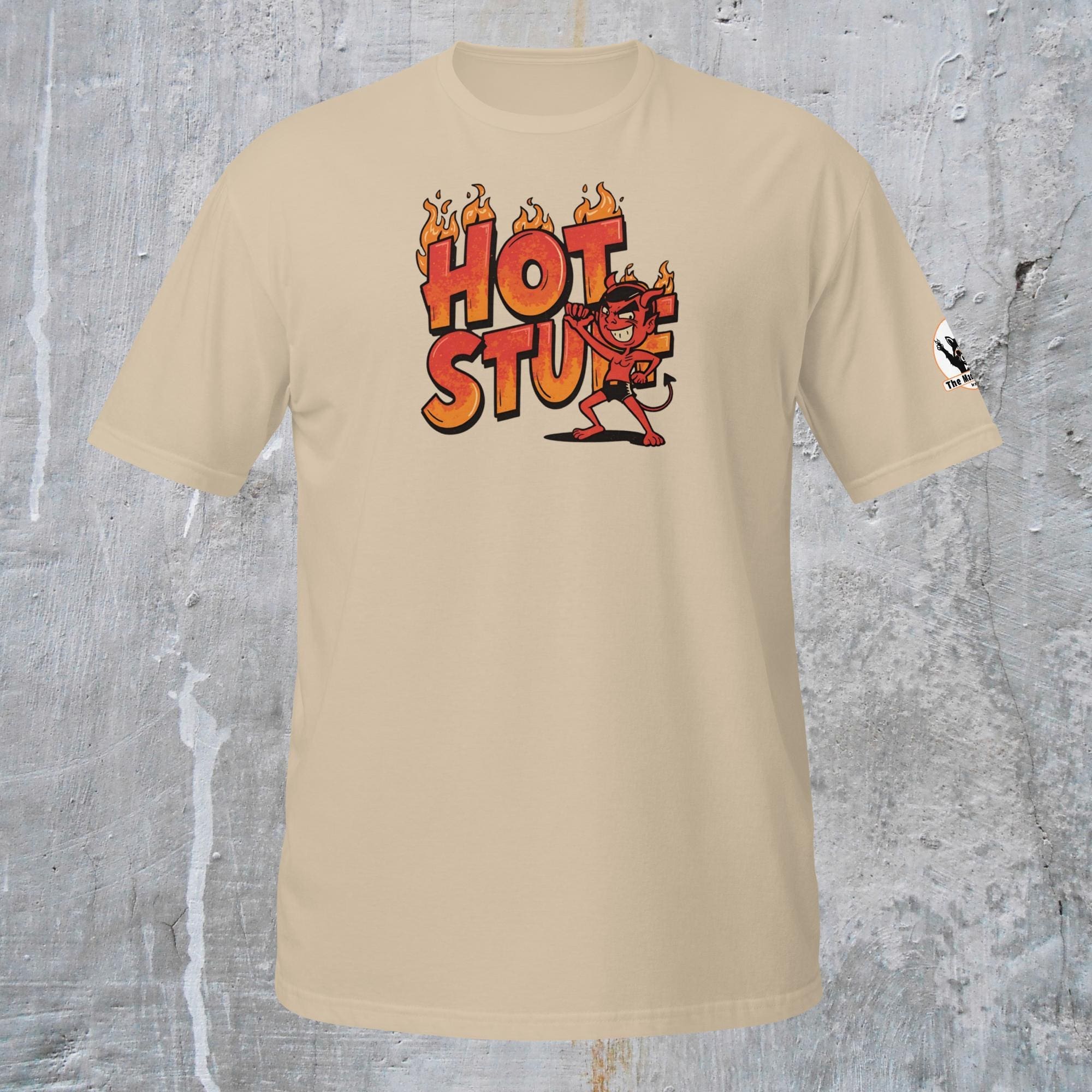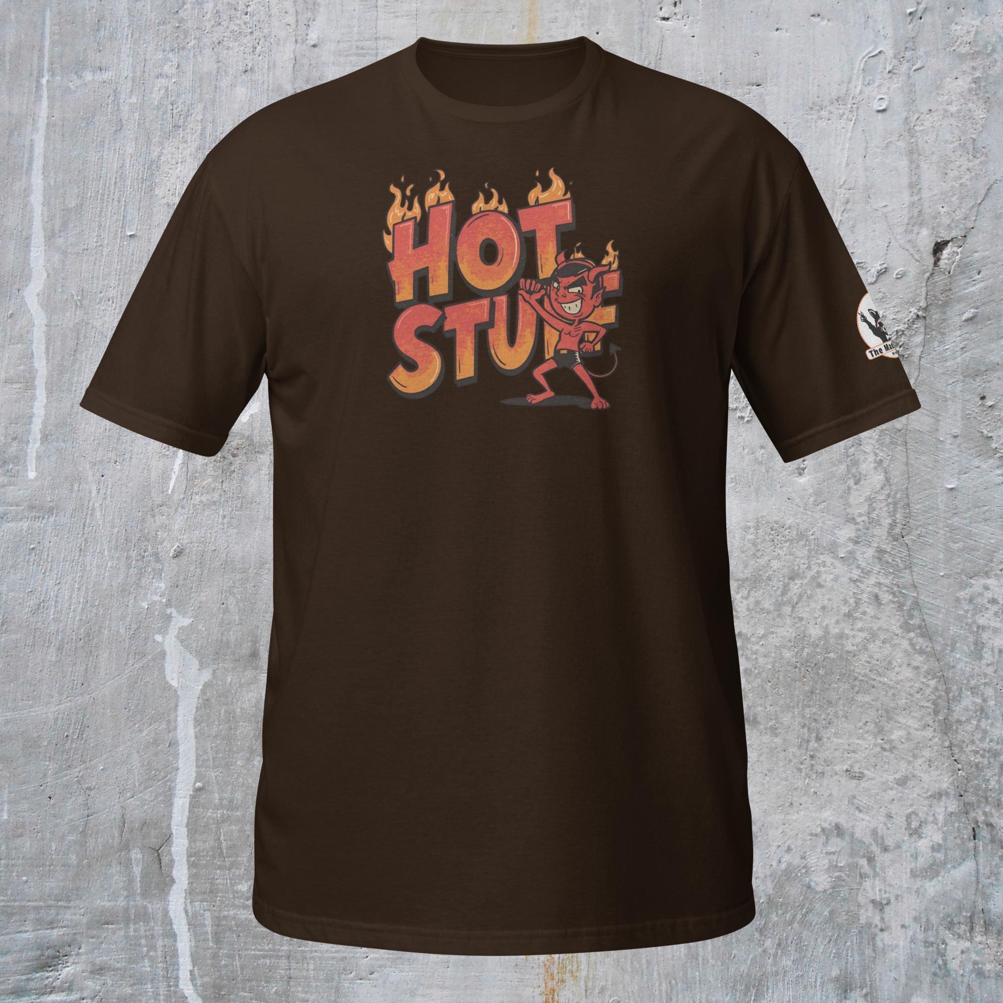 Our “Hot Stuff: The Original Fire Hazard” design is the antidote to subtle style. This description features a ridiculously confident, retro-era Devil, looking like he just stepped off the cover of a 1950s comic book and immediately caused a small but stylish disaster. He sports a self-satisfied, mischievous smile, clearly aware of his own superior heat. Behind him, the words “Hot Stuff.” are literally bursting into flames, because simply being hot wasn’t dramatic enough. He didn’t ask for the flames, they just happen when he walks into a room.
